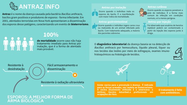 Antraz é o nome da doença causada pela bactéria Bacillus anthracis, bacilos gram positivos e produtores de esporos - forma infectante. Em 2001, atentados terroristas em Nova York apresentaram a disseminação dos esporos desse patógeno, caracterizando um evento de bioterrorismo.