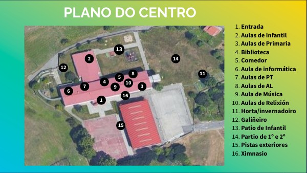 As aulas de infantil están situadas na planta baixa do edificio. 4º e 5º de infantil na parte traseira e 6º de infantil na parte dianteira.