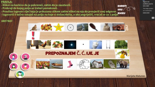 PRAVILA: - Klikni na kockicu da ju pokreneš, zatim da ju zaustaviš. - Prebroji do kojeg polja se trebaš pomaknuti. - Pravilno izgovori riječ koja je prikazana slikom zatim klikni na nju da provjeriš svoj odgovor. - Izgovoriš li točno ostaješ na polju na koje si došao/došla, a ako pogriješiš, vraćaš se za 1 polje. SRETNO!