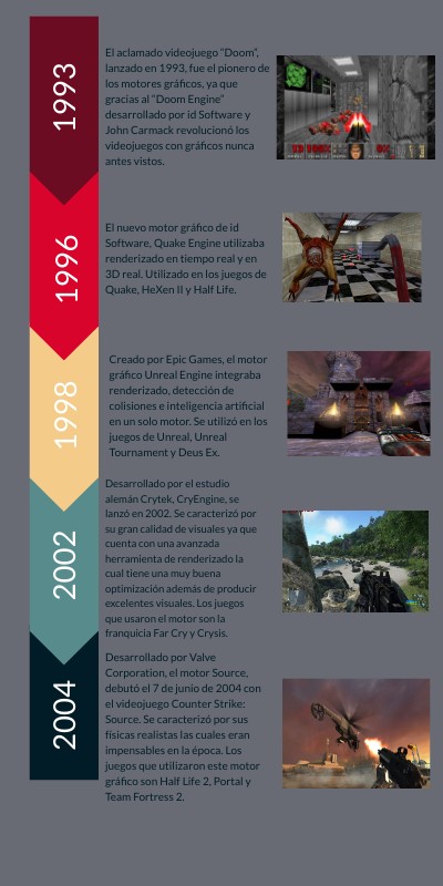 El aclamado videojuego “Doom”, lanzado en 1993, fue el pionero de los motores gráficos, ya que gracias al “Doom Engine” desarrollado por id Software y John Carmack revolucionó los videojuegos con gráficos nunca antes vistos.