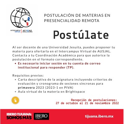 Al ser docente de una Universidad Jesuita, puedes proponer tu materia para ofertarla en el Intercampus Virtual de AUSJAL.Contacta a tu Coordinación Académica para que autorice la postulación en el formato correspondiente.