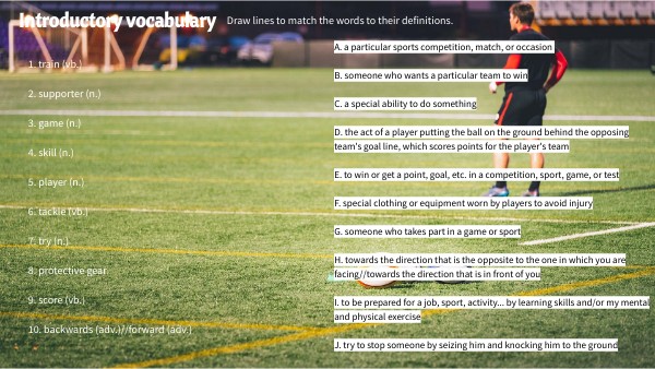1. train (vb.) 2. supporter (n.) 3. game (n.) 4. skill (n.) 5. player (n.) 6. tackle (vb.) 7. try (n.) 8. protective gear 9. score (vb.) 10. backwards (adv.)//forward (adv.)