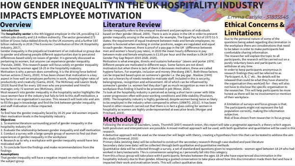 Introduction The hospitality sector is the 4th biggest employer in the UK, providing 3.2 million jobs directly and 2.8 million indirectly. The sector generated £73 billion of Gross Value Added directly to the UK economy and.a further £87 billion indirectly in 2016 (The Economic Contribution of the UK Hospitality Industry, 2017). Gender inequality is the prejudicial treatment of an individual or group due to gender and allowing people different opportunities due to perceived differences based solely on issues of gender. It is generally discussed as pertaining to women, but anyone can experience gender inequality (Parziale, 2008). This research paper will focus solely on gender inequality issues faced by women aged 18-25 in the hospitality industry. Motivation is why a person does something, it is the driving force behind human actions (Cherry, 2020). It has been shown that motivation is a key aspect in how well an employee performs in work, showing higher rates of productivity and creativity (Ganta, 2014). The McKinsey and Leanin Study (2019) found that for every 100 men who are promoted and hired to manager, only 72 women are (McKinsey, 2019) Most research into gender inequality in the hospitality sector highlights the issue women face in the industry but fails to link to this staff motivation, a key factor in an organisation's success. This research will look into and aim to fill this gap in knowledge and find the link between gender inequality and staff motivation in those impacted. Aim To find how the gender inequality faced by 18-25 year old women impacts their motivation levels in the hospitality industry. Objectives 1. To examine literature surrounding proof of gender inequality in the hospitality industry UK 2. Evaluate the relationship between gender inequality and staff motivation 3. Conduct a survey with a large sample group of women to find out their experiences of gender inequality in the workplace 4. Research as to why a workplace with gender inequality would have less motivated staff 5. To conclude from the findings and make recommendations from the findings Assumptions That gender inequality will have a negative impact on motivation levels on the subject group