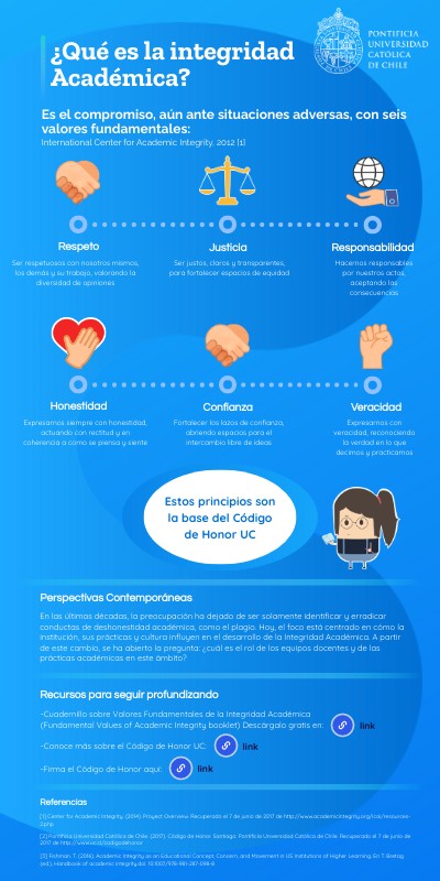 [2] Pontificia Universidad Católica de Chile. (2017). Código de Honor. Santiago: Pontificia Universidad Católica de Chile. Recuperado el 7 de junio de 2017 de http://www.uc.cl/codigodehonor