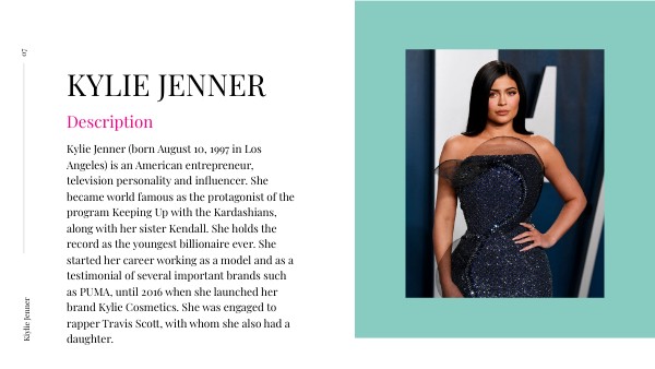 Kylie Jenner (born August 10, 1997 in Los Angeles) is an American entrepreneur, television personality and influencer. She became world famous as the protagonist of the program Keeping Up with the Kardashians, along with her sister Kendall. She holds the record as the youngest billionaire ever. She started her career working as a model and as a testimonial of several important brands such as PUMA, until 2016 when she launched her brand Kylie Cosmetics. She was engaged to rapper Travis Scott, with whom she also had a daughter.
