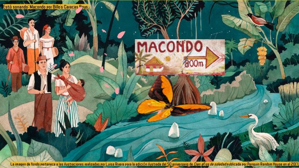 La imagen de fondo pertenece a las ilustraciones realizadas por Luisa Rivera para la edición ilustrada del 50 aniversario de Cien años de soledad publicada por Penguin Random House en el 2017.