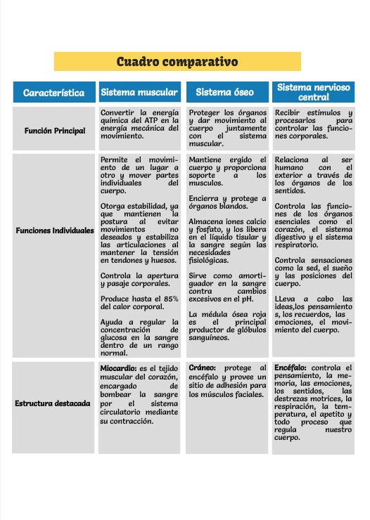 Permite el movimi- ento de un lugar a otro y mover partes individuales del cuerpo. Otorga estabilidad, ya que mantienen la postura al evitar movimientos no deseados y estabiliza las articulaciones al mantener la tensión en tendones y huesos. Controla la apertura y pasaje corporales. Produce hasta el 85% del calor corporal. Ayuda a regular la concentración de glucosa en la sangre dentro de un rango normal.