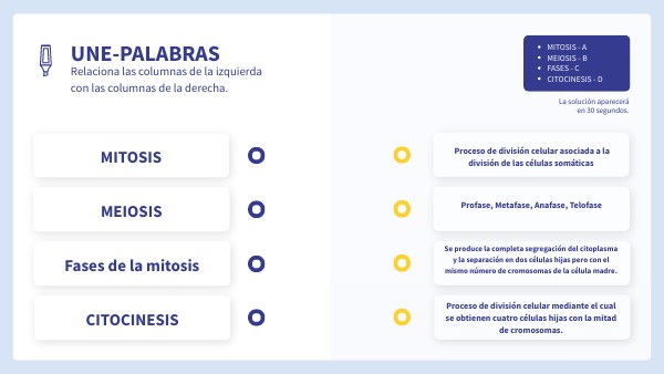 Proceso de división celular mediante el cual se obtienen cuatro células hijas con la mitad de cromosomas.