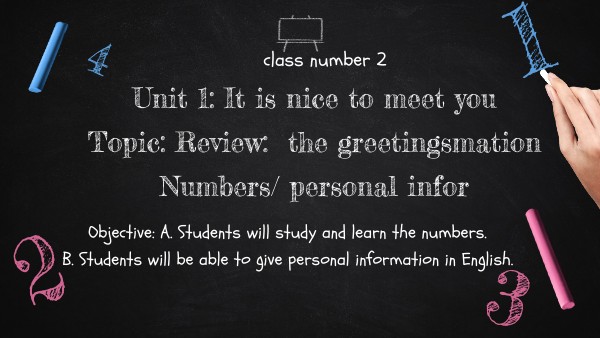 Objective: A. Students will study and learn the numbers. B. Students will be able to give personal information in English.