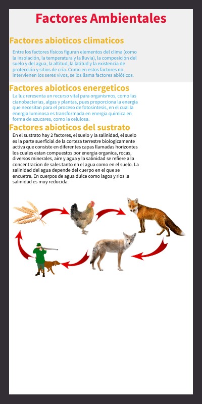 Entre los factores físicos figuran elementos del clima (como la insolación, la temperatura y la lluvia), la composición del suelo y del agua, la altitud, la latitud y la existencia de protección y sitios de cría. Como en estos factores no intervienen los seres vivos, se los llama factores abióticos.