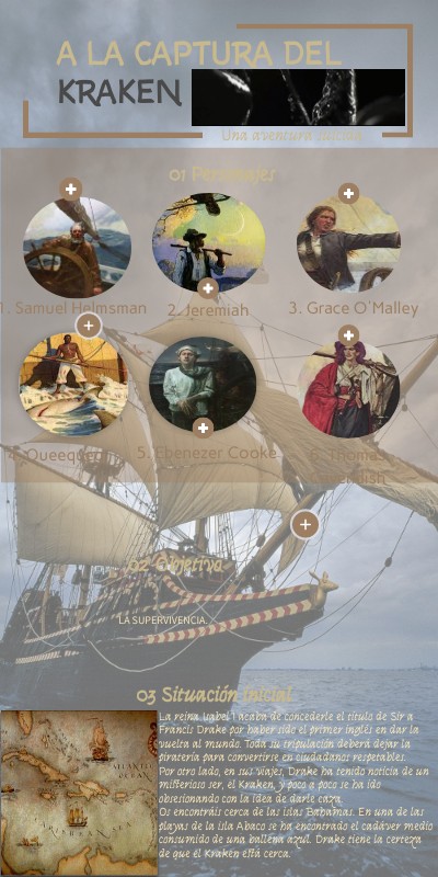 La reina Isabel I acaba de concederle el título de Sir a Francis Drake por haber sido el primer inglés en dar la vuelta al mundo. Toda su tripulación deberá dejar la piratería para convertirse en ciudadanos respetables.Por otro lado, en sus viajes, Drake ha tenido noticia de un misterioso ser, el Kraken, y poco a poco se ha ido obsesionando con la idea de darle caza. Os encontráis cerca de las islas Bahamas. En una de las playas de la isla Abaco se ha encontrado el cadáver medio consumido de una ballena azul. Drake tiene la certeza de que el Kraken está cerca.