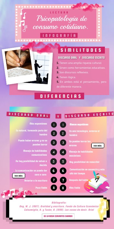 Bibliografía:Ong, W. J. (1987). Oralidad y escritura. Fondo de Cultura Económica Calsamiglia, H. y Tusón, A. (1999). Las cosas de decir. Ariel