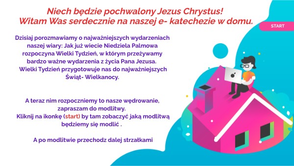 Dzisiaj porozmawiamy o najważniejszych wydarzeniach naszej wiary: Jak już wiecie Niedziela Palmowa rozpoczyna Wielki Tydzień, w którym przeżywamy bardzo ważne wydarzenia z życia Pana Jezusa. Wielki Tydzień przygotowuje nas do najważniejszych Świąt- Wielkanocy. A teraz nim rozpoczniemy to nasze wędrowanie, zapraszam do modlitwy. Kliknij na ikonkę (start) by tam zobaczyć jaką modlitwą będziemy się modlić . A po modlitwie przechodz dalej strzałkami