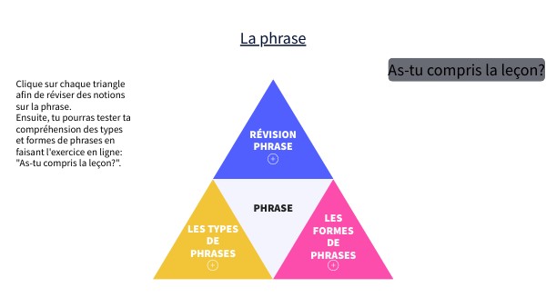 Clique sur chaque triangle afin de réviser des notions sur la phrase. Ensuite, tu pourras tester ta compréhension des types et formes de phrases en faisant l'exercice en ligne: "As-tu compris la leçon?".