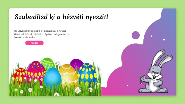 Ha helyesen megoldod a feladatokat, akkor a kapott kóddal kinyithatod a nyúlketrecet és a nyuszi elindulhat répát vásárolni. Megtalálod a húsvéti tojásokat is.