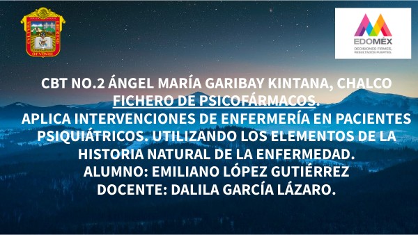 CBT No.2 Ángel María Garibay Kintana, Chalco Fichero de PsicofÁrmacos. Aplica Intervenciones De EnfermerÍa En Pacientes PsiquiÁtricos. Utilizando Los Elementos De La Historia Natural De La Enfermedad. Alumno: Emiliano López GutiÉrrEz Docente: Dalila García Lázaro.