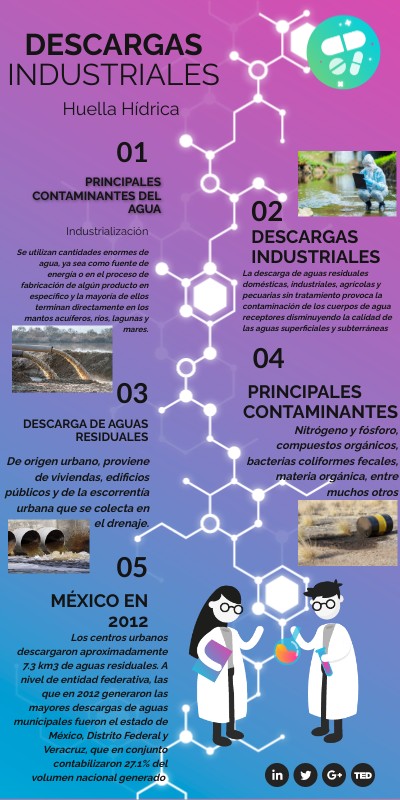 Se utilizan cantidades enormes de agua, ya sea como fuente de energía o en el proceso de fabricación de algún producto en específico y la mayoría de ellos terminan directamente en los mantos acuíferos, ríos, lagunas y mares.