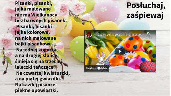 Pisanki, pisanki, jajka malowane nie ma Wielkanocy bez barwnych pisanek. Pisanki, pisanki jajka kolorowe, na nich malowane bajki pisankowe. Na jednej kogucik, a na drugiej słońce, śmieją się na trzeciej laleczki tańczące. Na czwartej kwiatuszki, a na piątej gwiazdki. Na każdej pisance piękne opowiastki.