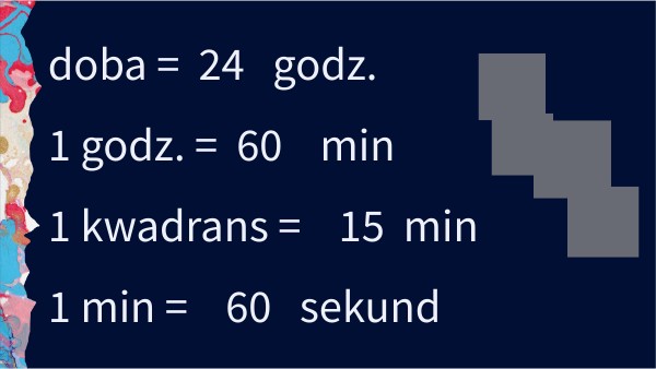 doba = 24 godz. 1 godz. = 60 min 1 kwadrans = 15 min 1 min = 60 sekund