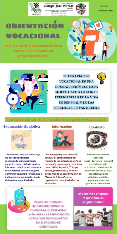 ¡Hola! Aquí les comparto esta "hoja de ruta" que plasma y anticipa un poco el recorrido que nos propondremos realizar este año en la asignatura Orientación Vocacional. La infografía reúne información concisa y además hay elementos interactivos para que exploren mientras la leen.