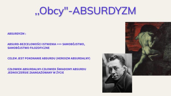 ABSURDYZM : ABSURD-BEZCELOWOŚCI ISTNIENIA ==> SAMOBÓJSTWO, SAMOBÓJSTWO FILOZOFICZNE CELEM JEST POKONANIE ABSURDU (HEROIZM ABSURDALNY) CZŁOWIEK ABSURDALNY-CZŁOWIEK ŚWIADOMY ABSURDU JEDNOCZEŃSIE ZAANGAŻOWANY W ŻYCIE