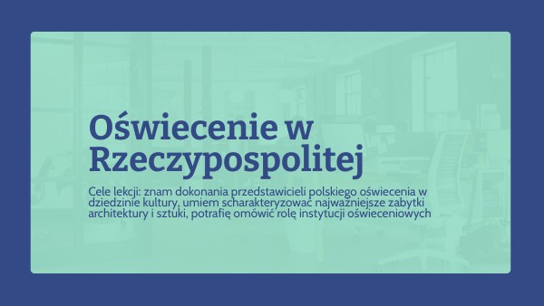 Cele lekcji: znam dokonania przedstawicieli polskiego oświecenia w dziedzinie kultury, umiem scharakteryzować najważniejsze zabytki architektury i sztuki, potrafię omówić rolę instytucji oświeceniowych