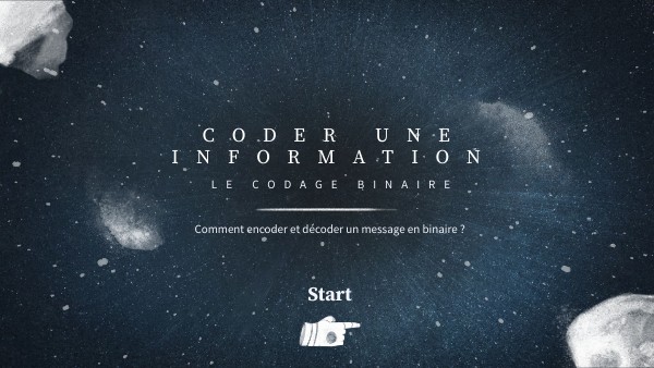 Vous recevez de la base l’annonce qu’une tempête se prépare. L’équipe de la base a demandé une information : le temps que mettra le rover à rentrer à la base.Aujourd’hui, vous devez coder votre réponse en binaireLe message envoyé à la base comporte seulement des lettres majuscules, des espaces et des points (soit 28 sortes de caractères textuels). Décidez de combien de nombre binaire vous aurez absolument besoin pour encoder chaque lettre (en cas de besoin, se référer à votre travail de la séance précédente.