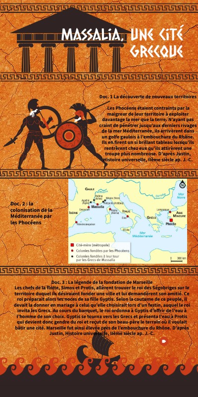 Doc. 3 : La légende de la fondation de MarseilleLes chefs de la flotte, Simos et Protis, allèrent trouver le roi des Ségobriges sur le territoire duquel ils désiraient fonder une ville et lui demandèrent son amitié. Ce roi préparait alors les noces de sa fille Gyptis. Selon la coutume de ce peuple, il devait la donner en mariage à celui qu’elle choisirait lors d’un festin, auquel le roi invita les Grecs. Au cours du banquet, le roi ordonna à Gyptis d’offrir de l’eau à l’homme de son choix. Gyptis se tourna vers les Grecs et présenta l’eau à Protis qui devient donc gendre du roi et reçut de son beau-père le terrain où il voulait bâtir une cité. Marseille fut ainsi élevée près de l’embouchure du Rhône. D’après Justin, Histoire universelle, IIème siècle ap. J.-C.