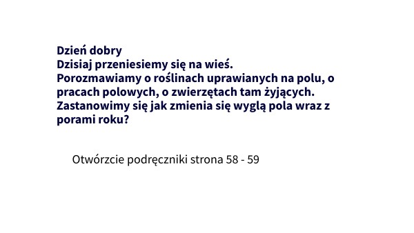 Dzień dobryDzisiaj przeniesiemy się na wieś. Porozmawiamy o roślinach uprawianych na polu, o pracach polowych, o zwierzętach tam żyjących. Zastanowimy się jak zmienia się wyglą pola wraz z porami roku?