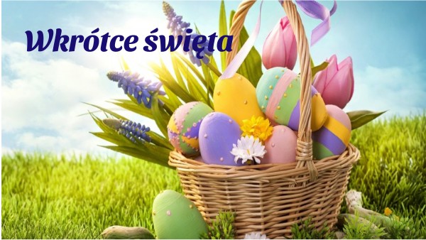 Łukasz przygotowuje się do świąt.Zasiał w doniczce........................... Kupił cukrowego.............................., wiklinowy ............................ W te święta pojedzie do babci. Poświęcą razem........................., upieką pyszną.................... i ............................. Pomalują .........................., a w poniedziałek nie zapomną o .................................