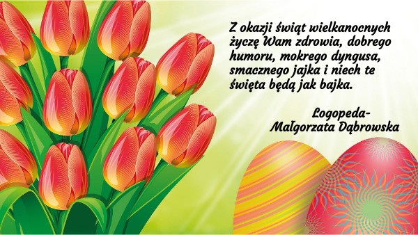 Z okazji świąt wielkanocnych życzę Wam zdrowia, dobrego humoru, mokrego dyngusa, smacznego jajka i niech te święta będą jak bajka. Logopeda- Małgorzata Dąbrowska