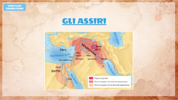 - attorno circa 2000 a.C. (1950 a.C.) fino al 612 a.C.Espansioni territoriali- attorno 2000 a.C. nasce la civiltà con la fondazione di Assur (rive Tigri)- dal 1100 iniziano le prime conquiste dei territori vicini: sottomette parte della Babilonia - la massima espansione si ha nell'800 con l'estensione fino all'Egitto --> grande Impero con città fortificate da mura imponenti con capitale Ninive- nel 612 a.C. i popoli conquistati (tra cui quelli Babilonesi) si ribellano e distruggono Ninive --> FINE IMPERO ASSIRO