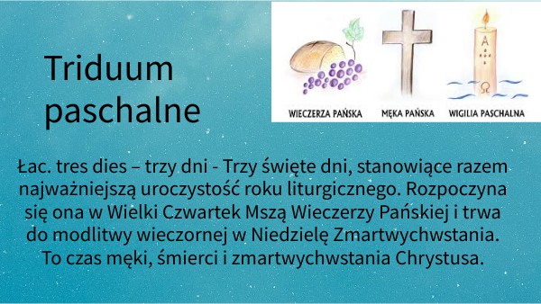 Pascha (aram. pesah – przechodzić) Jezus spożywał z uczniami ostatnią w życiu paschę. To najważniejsze święto w Starym Testamencie obchodzone na pamiątkę wyjścia z niewoli egipskiej. Dla nas pascha to przejście Chrystusa przez śmierć do życia.
