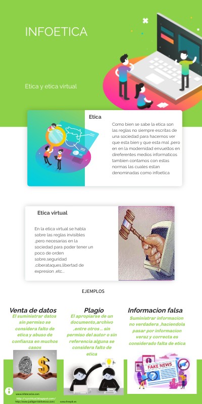Como bien se sabe la etica son las reglas no siempre escritas de una sociedad para hacernos ver que esta bien y que esta mal ,pero en en la modernidad envueltos en direferentes medios informaticos tambien contamos con estas normas las cuales estan denominadas como infoetica