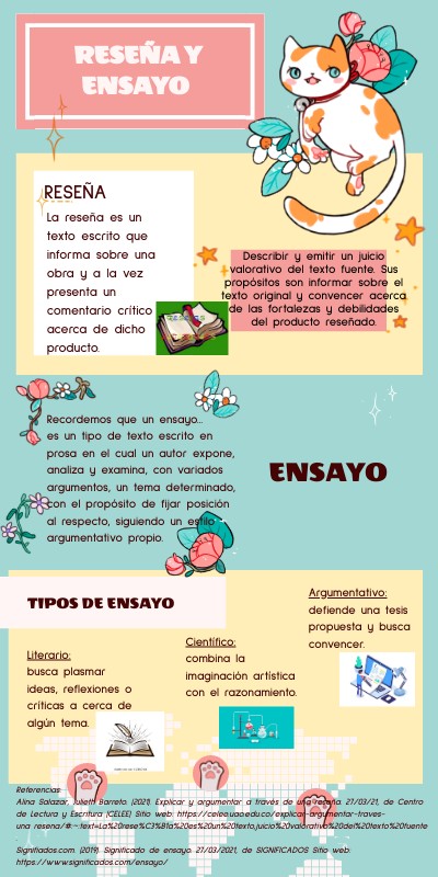 Referencias:Alina Salazar, Julieth Barreto. (2021). Explicar y argumentar a través de una reseña. 27/03/21, de Centro de Lectura y Escritura (CELEE) Sitio web: https://celee.uao.edu.co/explicar-argumentar-traves-una resena/#:~:text=La%20rese%C3%B1a%20es%20un%20texto,juicio%20valorativo%20del%20texto%20fuente. Signifiados.com. (2019). Significado de ensayo. 27/03/2021, de SIGNIFICADOS Sitio web: https://www.significados.com/ensayo/
