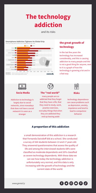 a small demonstration of this addiction is a research that Fernanda Daividoff did at a school. She conducted a survey of 264 students between 13 and 17 years old. They answered questionnaires that assess the quality of life and among the interviewed students 68% were classified as moderate dependents and 20% classified as severe technology dependents. With these data we can see how today the technology addiction is unfortunately very normal, and this data is only increasing with the growth of technology and the current state of the world.