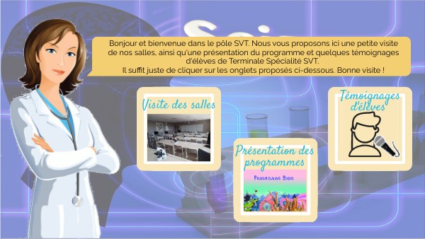Bonjour et bienvenue dans le pôle SVT. Nous vous proposons ici une petite visite de nos salles, ainsi qu'une présentation du programme et quelques témoignages d'élèves de Terminale Spécialité SVT. Il suffit juste de cliquer sur les onglets proposés ci-dessous. Bonne visite !