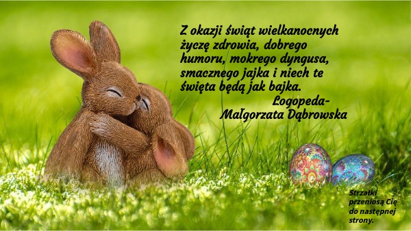 Z okazji świąt wielkanocnych życzę zdrowia, dobrego humoru, mokrego dyngusa, smacznego jajka i niech te święta będą jak bajka. Logopeda- Małgorzata Dąbrowska