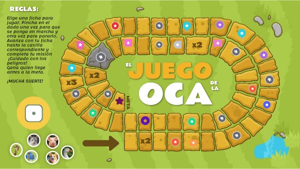Elige una ficha para jugar. Pincha en el dado una vez para que se ponga en marcha y otra vez para pararlo. Avanza con tu ficha hasta la casilla correspondiente y completa tu misión ¡Cuidado con los peligros! Gana quien llege antes a la meta. ¡MUCHA SUERTE!