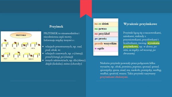 PRZYIMEK to niesamodzielna i nieodmienna część mowy. Informuje między innymi o :