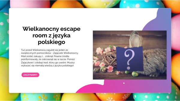 Tuż przed Wielkanocą zagubił się jeden ze świątecznych pomocników - Zajączek Wielkanocny. Miał zrobić zakupy i.... zniknął. Pewne źródła poinformowały, że zatrzasnął się w norze. Pomóż Zajączkowi i zdobąź kod, który go uwolni. Musisz wykazać się niemałą wiedzą z języka polskiego!