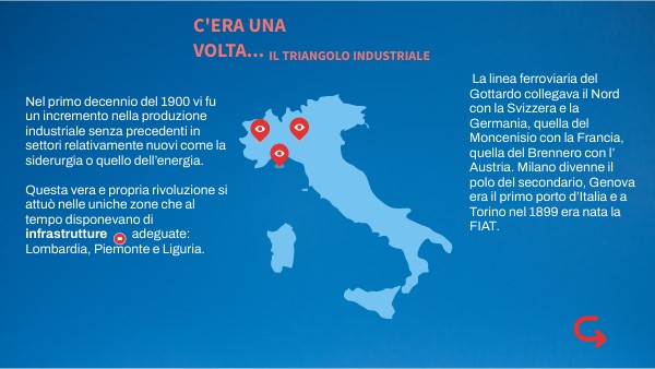 Nel primo decennio del 1900 vi fu un incremento nella produzione industriale senza precedenti in settori relativamente nuovi come la siderurgia o quello dell’energia.Questa vera e propria rivoluzione si attuò nelle uniche zone che al tempo disponevano di infrastrutture adeguate: Lombardia, Piemonte e Liguria.