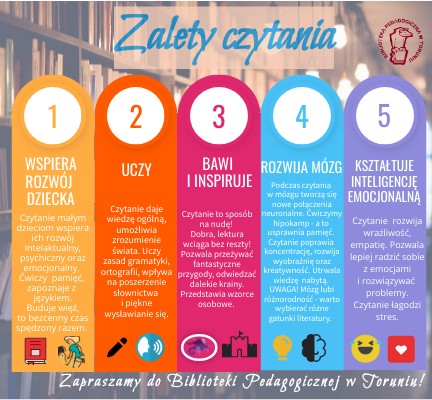 Czytanie daje wiedzę ogólną, umożliwia zrozumienie świata. Uczy zasad gramatyki, ortografii, wpływa na poszerzenie słownictwa i piękne wysławianie się.