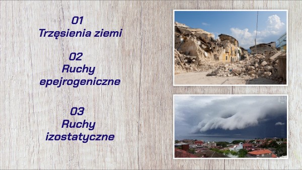 Sztuczne procesy, np.:- wydobywanie surowców - osuszanie lub nawadnianie terenów - komunikacja - testy broni atomowej