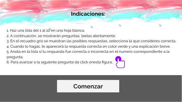 1. Haz una lista del 1 al 10 en una hoja blanca. 2. A continuación, se mostrarán preguntas, leelas atentamente. 3. En el recuadro gris se muestran las posibles respuestas, selecciona la que consideres correcta. 4. Cuando lo hagas, te aparecerá la respuesta correcta en color verde y una explicación breve. 5. Anota en la lista si tu respuesta fue correcta o incorrecta en el numero correspondiente a la pregunta. 6. Para avanzar a la siguiente pregunta da click enesta figura:.