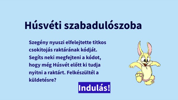 Szegény nyuszi elfelejtette titkos csokitojás raktárának kódját. Segíts neki megfejteni a kódot, hogy még Húsvét előtt ki tudja nyitni a raktárt. Felkészültél a küldetésre?