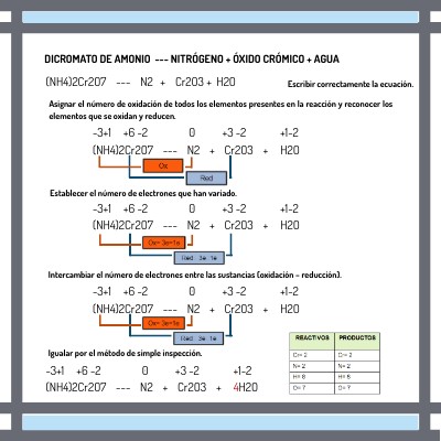 DICROMATO DE AMONIO --- NITRÓGENO + ÓXIDO CRÓMICO + AGUA