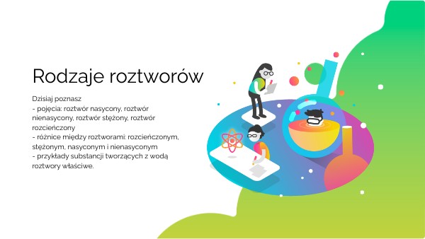 Dzisiaj poznasz- pojęcia: roztwór nasycony, roztwór nienasycony, roztwór stężony, roztwór rozcieńczony - różnice między roztworami: rozcieńczonym, stężonym, nasyconym i nienasyconym - przykłady substancji tworzących z wodą roztwory właściwe.