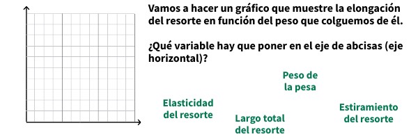 Vamos a hacer un gráfico que muestre la elongación del resorte en función del peso que colguemos de él. ¿Qué variable hay que poner en el eje de abcisas (eje horizontal)?