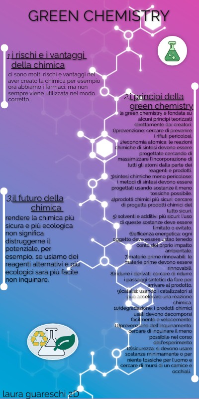 la green chemistry è fondata su alcuni principi teorizzati direttamente dai creatori: 1)prevenzione: cercare di prevenire i rifiuti pericolosi. 2)economia atomica: le reazioni chimiche di sintesi devono essere progettate cercando di massimizzare l'incorporazione di tutti gli atomi dalla parte dei reagenti e prodotti. 3)sintesi chimiche meno pericolose: i metodi di sintesi devono essere progettati usando sostanze il meno tossiche possibile. 4)prodotti chimici più sicuri: cercare di progetta prodotti chimici del tutto sicuri. 5) solventi e additivi più sicuri: l'uso di queste sostanze deve essere limitato o evitato. 6)efficenza energetica: ogni oggetto deve essere usato tenedo conto del proprio impatto ambientale. 7)materie prime rinnovabili: le materie prime devono essere rinnovabili. 8)ridurre i derivati: cercare di ridurre i passaggi sintetici da fare per arrivare al prodotto. 9)catalisi: usando i catalizzatori si può accelerare una reazione chimica. 10)degradazione: i prodotti chimici usati devono decomporsi facilmente e velocemente. 11)prevenzione dell'inquinamento: cercare di inquinare il meno possibile nel corso dell'esperimento 12)sicurezza: si devono usare sostanze minimamente o per niente tossiche per l'uomo e cercare di mursi di un camice e occhiali.